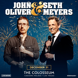 John Oliver, the Emmy and Writer’s Guild Award-winning writer and comedian, and Seth Meyers, Emmy and WGA Award-winning writer, New York Times best selling author, and host of “Late Night with Seth Meyers,” - two comedians, one stage on New Year’s Eve in Las Vegas at The Colosseum at Caesars Palace. The show will take place on Sunday, Dec. 31, 2023 at 8 p.m.
